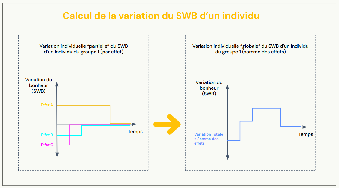 D’un point de vue schématique, pour un individu d’un groupe donné, on additionne les effets du projet sur les différentes variables micro sur le SWB sur l’individu. Ainsi, on obtient la variation totale du SWB de l’individu dans le temps.